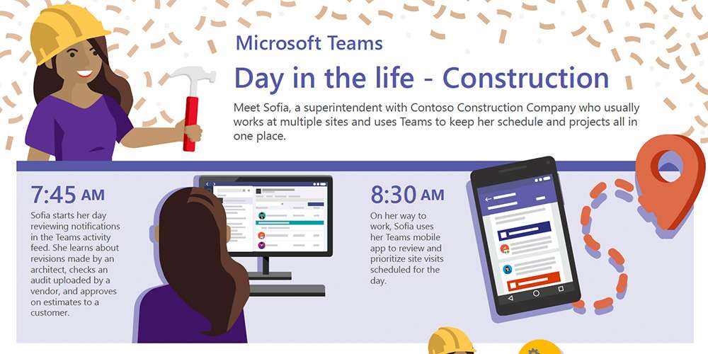 Sofia is a construction company superintendent who works at multiple sites and uses Teams to keep her schedule and projects all in one place. View this infographic to get a glimpse of a day in Sofia’s life — and how she uses productivity, collaboration, BI and enterprise mobility tools in Teams to stay on track.
