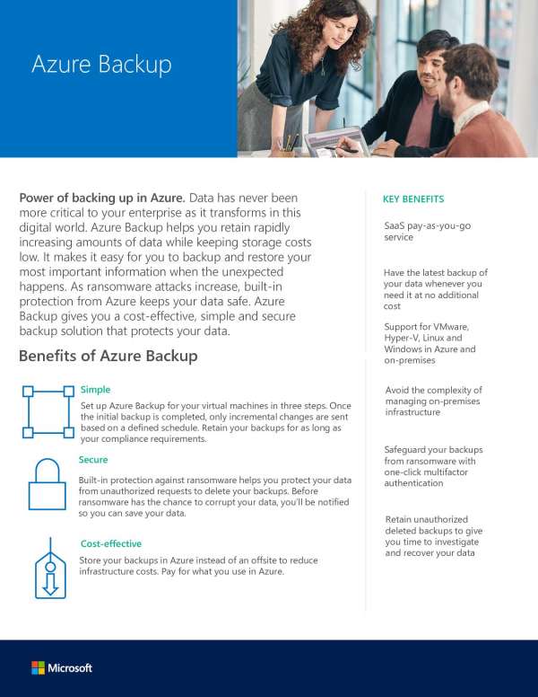 Your data is more important to your organization than ever before. In today’s technological world, having the tools to back up your information is vital to success. Azure Backup helps you retain rapidly increasing amounts of data while keeping storage costs low. It makes it easy for you to back up and restore your most important information when the unexpected happens.