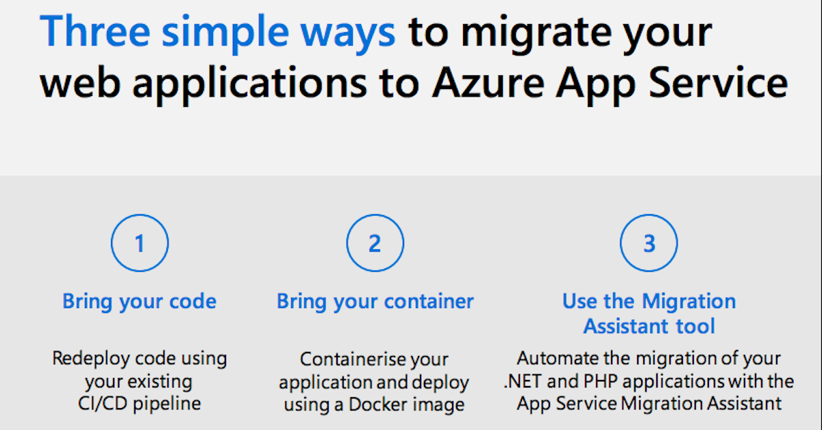 This infographic details three simple ways to migrate web applications to Azure App Service. Bring your code, bring your container, or use the Migration Assistant tool.