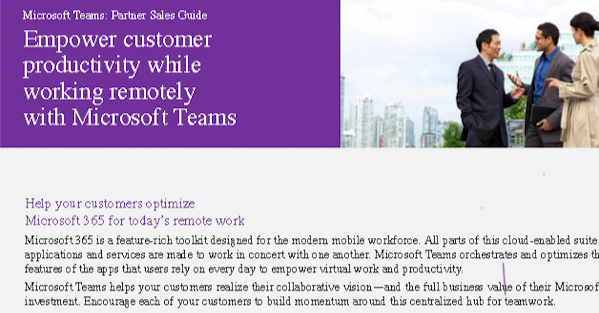 This sales guide offers information about the following topics: helping your customers optimise Microsoft 365 for today’s remote work, exciting them about their potential for productivity, and introducing them to the business benefits of Microsoft Teams. It also offers five steps to maximize the value of Microsoft Teams.