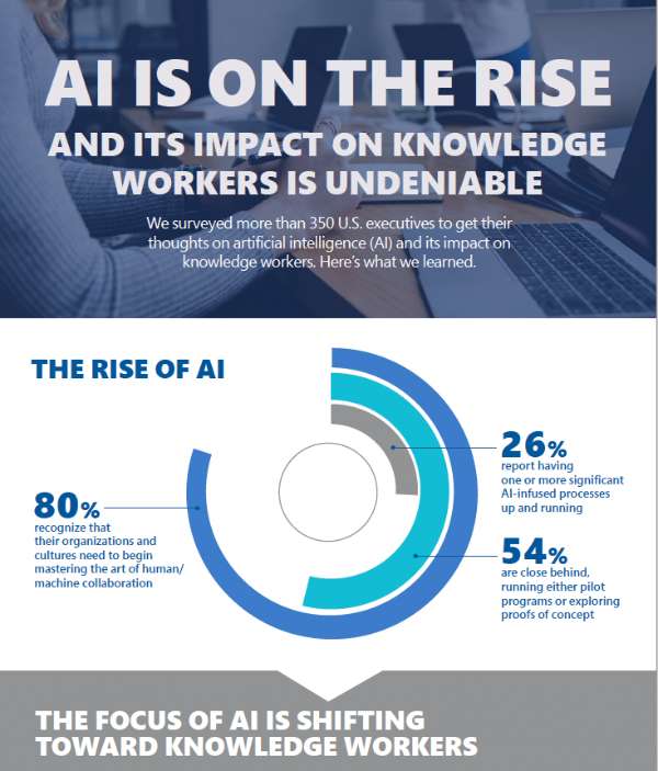 AI’s impact is growing. Soon it will reach beyond individual company success stories to touch entire industries and eventually society at large. In particular, executives are recognizing the impact AI will have on knowledge workers. Check out more insights from over 350 surveyed U.S. executives in this infographic. Want to learn how AI will influence your industry? Contact us today to learn how we can help you plan for the coming changes and adopt the right AI solution for your needs.