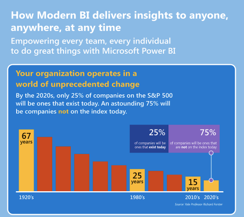 By the 2020s, only 25% of companies on the S&P 500 will be ones that exist today. An astounding 75% will be companies not on the index today. Check out this infographic to for an overview of how Power BI helps organizations thrive in a world of change by delivering insights to anyone, anywhere at any time.
