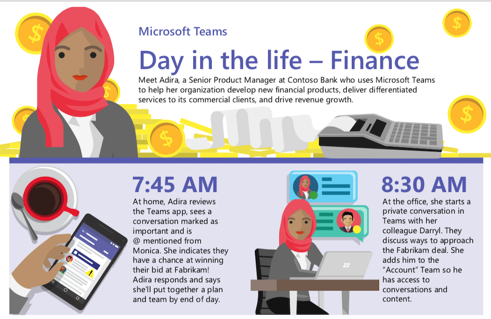 Adira is a senior project manager at a bank who works seamlessly between her laptop at the office and her tablet at home, relying on Microsoft Teams, OneNote within Teams, and Power BI dashboards to collaborate and share with team members. View this infographic to follow Adira through a typical day and to see how Teams enables her to get through her day productively and efficiently.